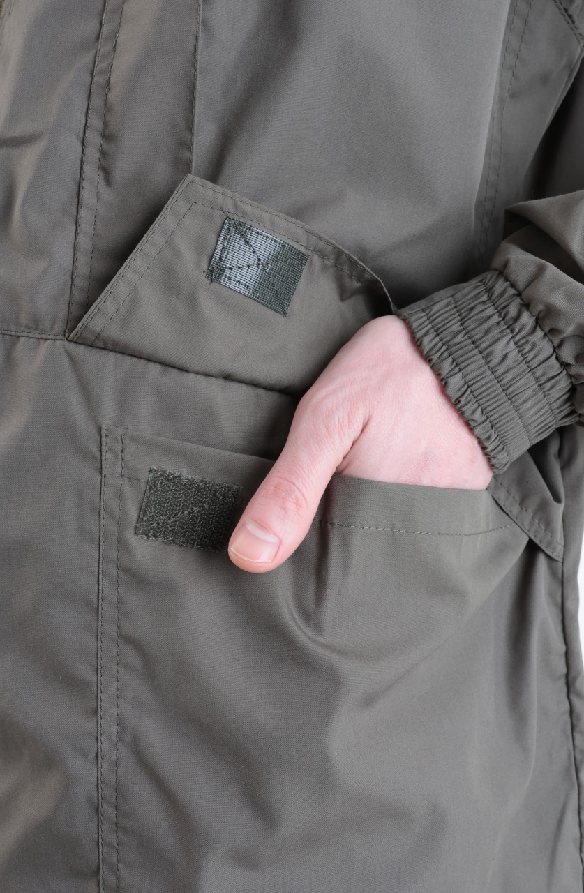 Удлиненная куртка по низу регулируется утяжками. Рукава куртки с манжетами, препятствуют проникновению насекомых. Капюшон регулируется по овалу лица шнуром. Антимоскитная сетка пристегивается к капюшону  на молнию и легко убирается в небольшой карман на груди. Широкие листочки четырех вместительных карманов защитят от попадания лесного сора.  Внутренний влагозащитный карман для ценных вещей и документов.